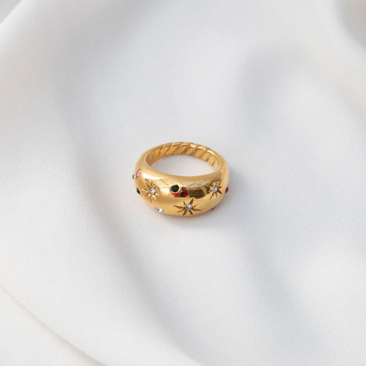 Stainless steel + gold-plated crescent ring. Embedded with multicoloured cubic zirconia. Available in sizes 6. 7 and 8.